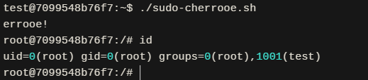 test@1f3f9f87e33c:~$ ./sudo-cherrooe.sh