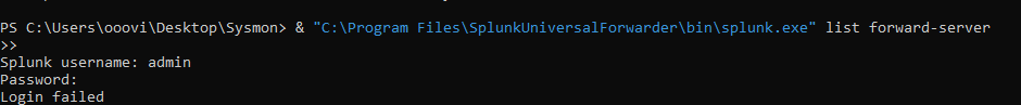 PS C:\Users\ooovi\Desktop\Sysmon> & "C:\Program Files\SplunkUniversalForwarder\bin\splunk.exe" list forward-server -auth admin:pwd