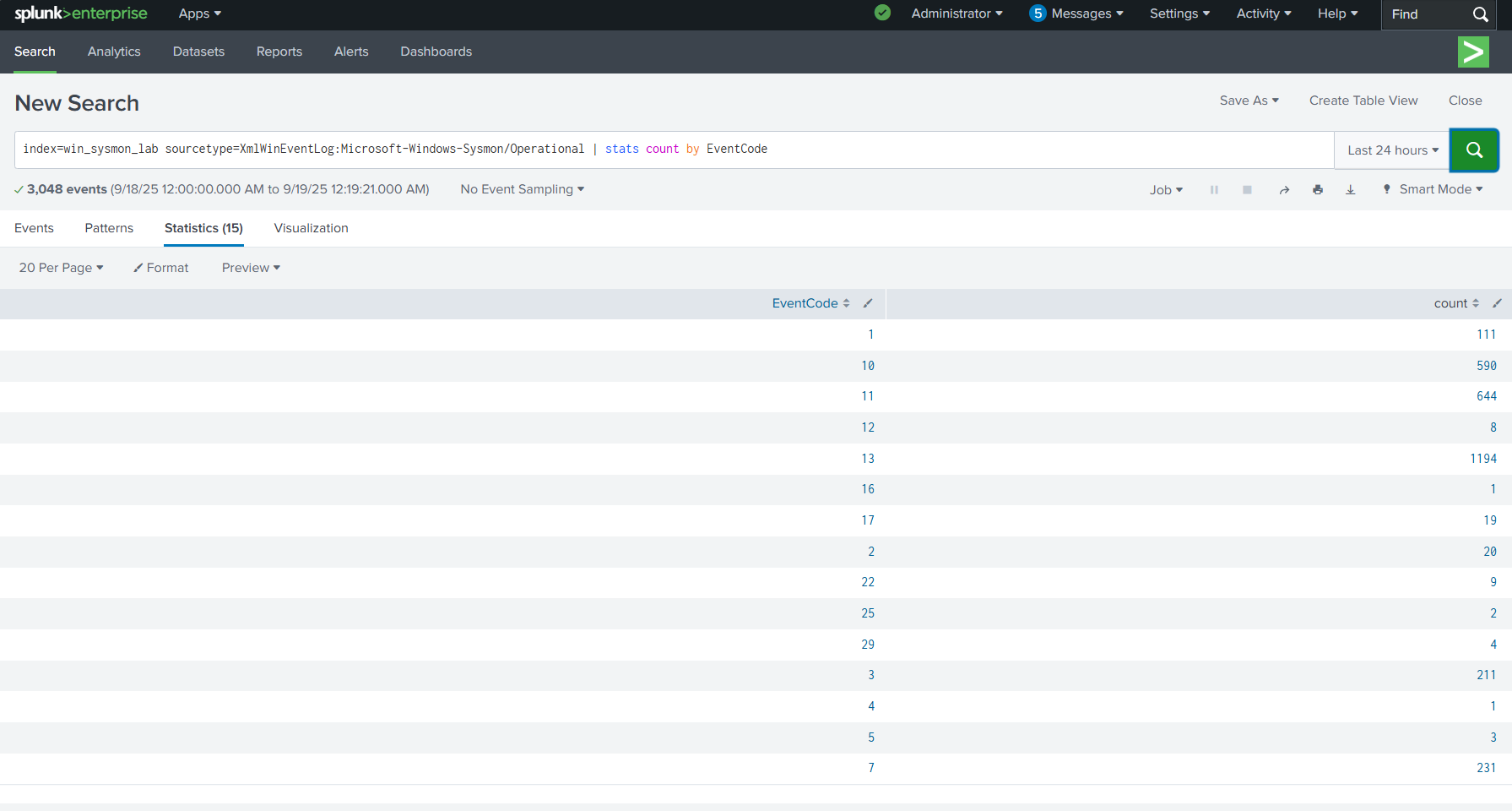 index=win_sysmon_lab sourcetype=XmlWinEventLog:Microsoft-Windows-Sysmon/Operational | stats count by EventCode