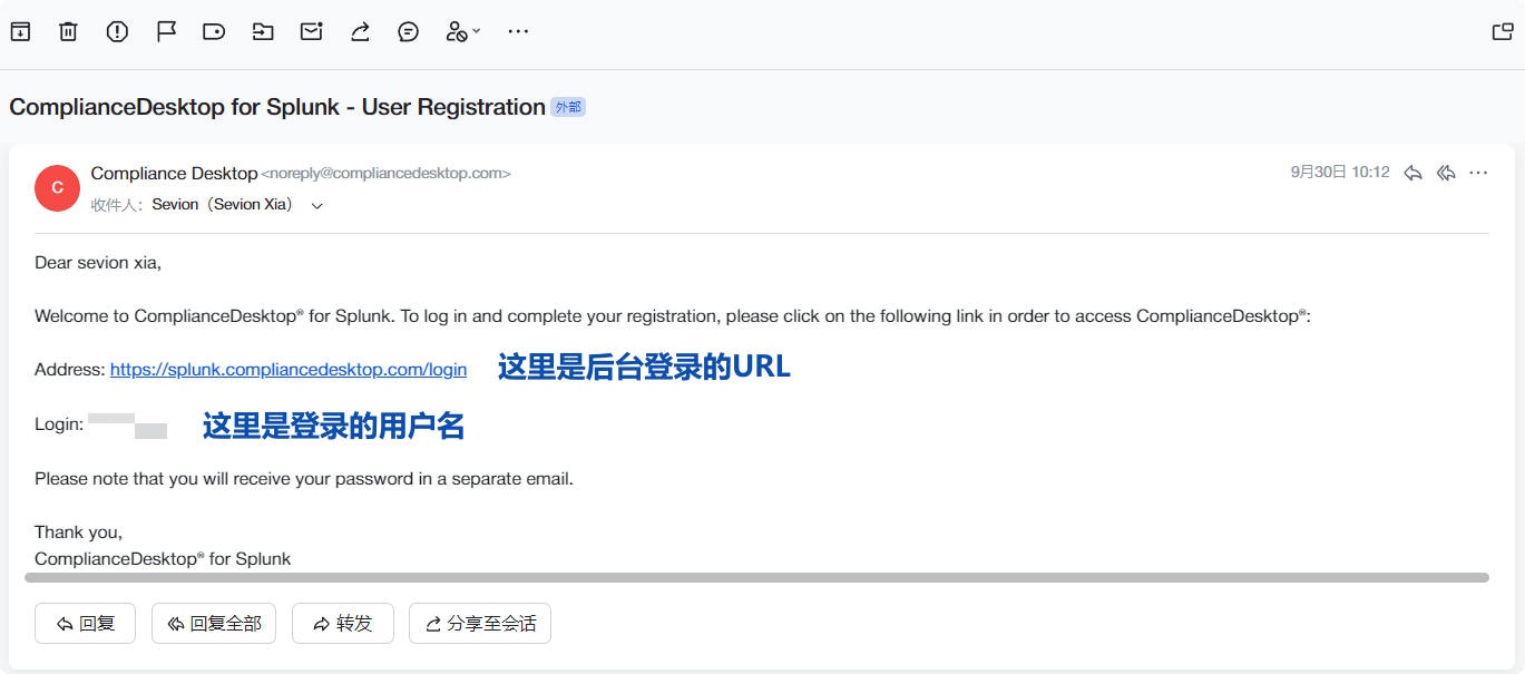 13.随后你会收到另外三封邮件(内容分别包含:后台登录URL、用户名、密码),如下: