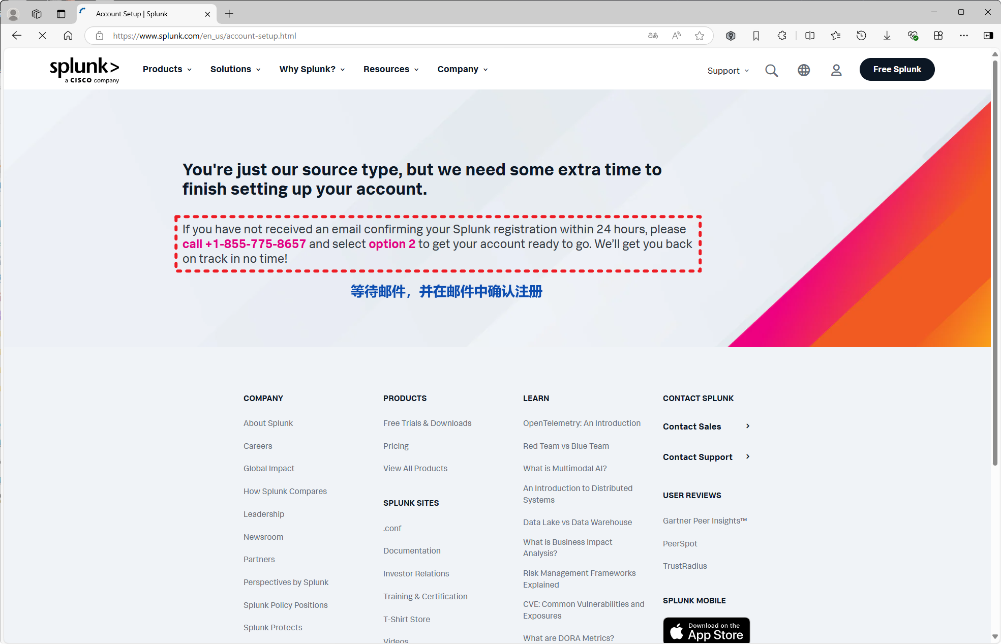 6.注册成功后跳转界面,Splunk要求你去邮箱查收邮件,并在邮件中进行确认注册。