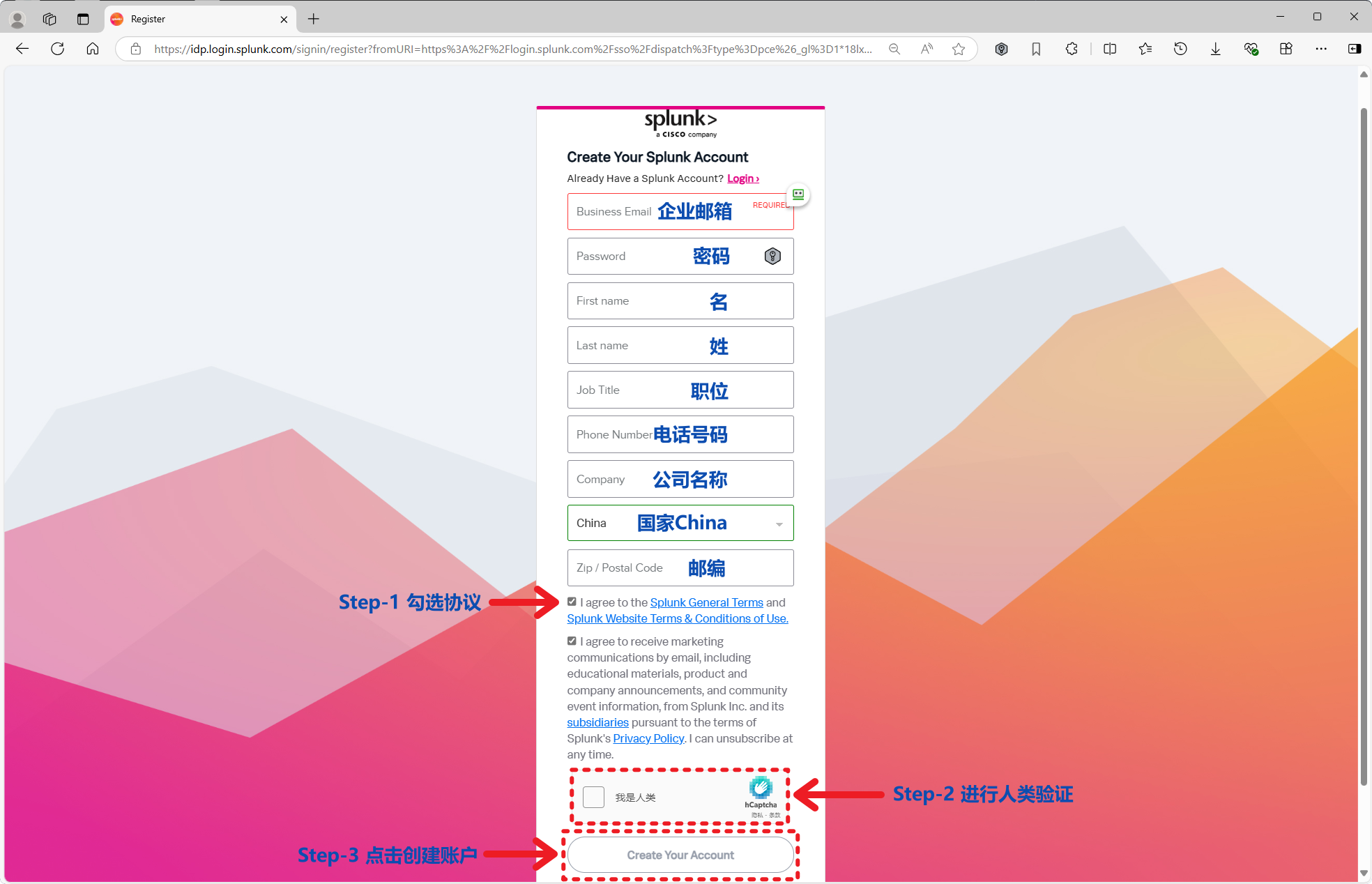 5.填写账户信息,勾选协议说明及人机验证(有概率不要求验证),最后注册账户。